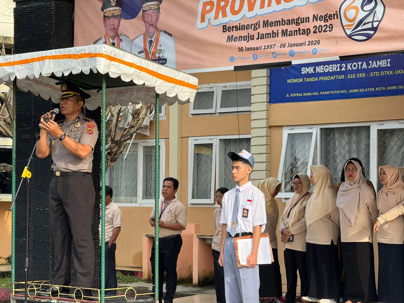 Upacara yang digelar di halaman sekolah itu dipimpin Kepala SMKN 2 Kota Jambi, Dr. Woro Handayani, S.Pd., M.Pd. Kasubdit Bintibsos Ditbinmas Polda Jambi, AKBP Dr. Dadang Djoko Karyanto, M.H., M.Pd., bertindak sebagai Inspektur Upacara. Kegiatan tersebut diikuti sekitar 150 guru dan tenaga kependidikan serta 2.500 siswa SMKN 2 Kota Jambi.